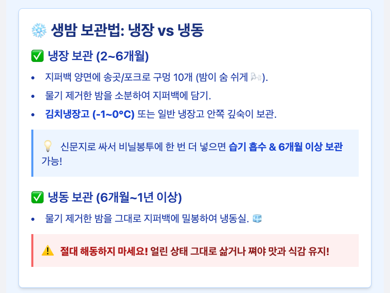 이제 본격적으로 보관 단계로 들어갑니다. 생밤 보관법은 크게 냉장 보관과 냉동 보관 두 가지가 있는데요, 각각 장단점이 있어요. 언제 먹을 건지에 따라 선택하시면 돼요!