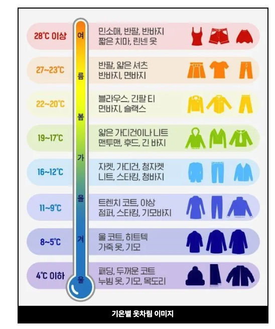 가장 중요한 건 자신의 체감 온도를 파악하는 것입니다. 추위를 잘 타는 분이라면 제가 제시한 것보다 한 단계 더 따뜻하게, 더위를 잘 타는 분이라면 한 단계 더 가볍게 입으시면 됩니다.
