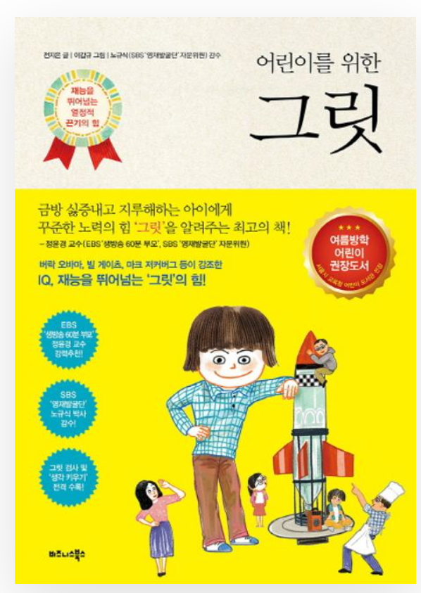 그릿을 읽고, 저희 아이를 위해 '어린이를 위한 그릿'도 구매해서 주었는데요. 아직 어린 아이에겐 어떤 의미로 다가왔을지는 모르겠으나, 커가면서 조금이나마 그릿의 가치를 이해하고, 자신의 인생에서 포기하지 않는 힘을 발휘할 수 있기를 바랍니다. 부모로서 저부터 그릿을 실천하는 모습을 보여줄 수 있도록 매일 노력하겠습니다.