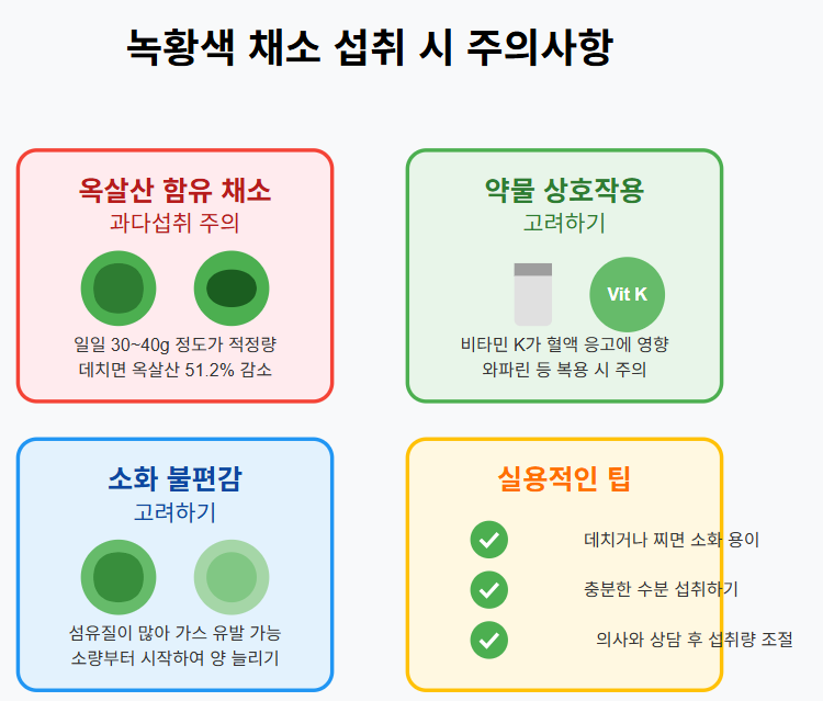 녹황색 채소는 대부분의 사람에게 안전하고 건강에 좋지만, 몇 가지 주의해야 할 점이 있습니다.