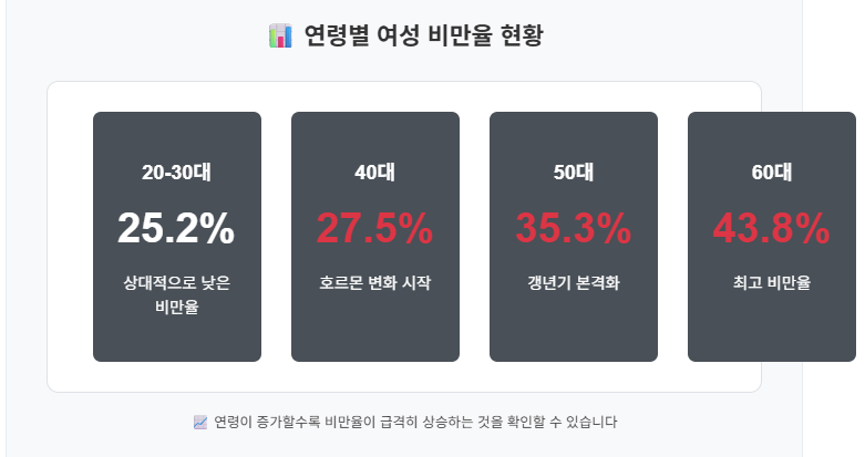 40대 여성의 비만율은 27.5%, 50대는 35.3%로 급격히 증가합니다. 이는 호르몬 변화와 기초대사량 감소 때문인데요, 그래서 더욱 똑똑한 다이어트 보조제 선택이 중요해요!