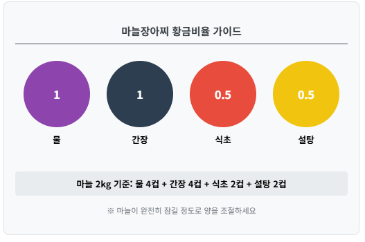 💡 팁: 마늘장아찌의 황금비율은 물 1 : 간장 1 : 식초 0.5 : 설탕 0.5입니다. 이 비율로 마늘이 잠길 정도의 양을 만들면 됩니다. 계량컵이 없다면 머그컵이나 종이컵을 활용해도 괜찮아요!