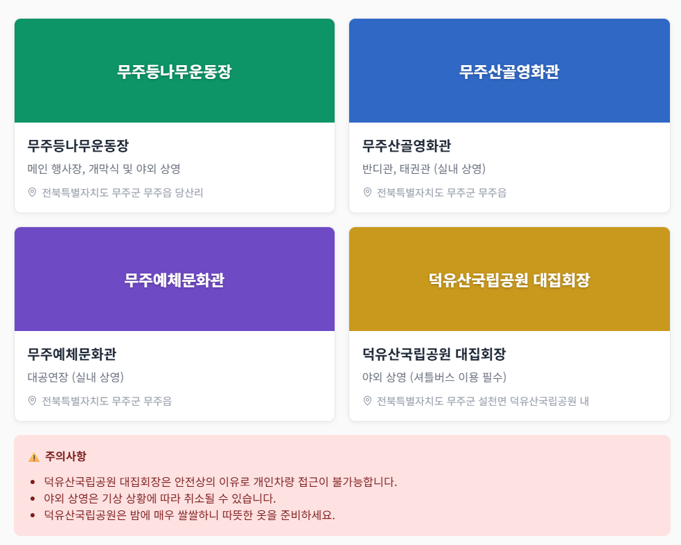 - 개최 장소: 전북특별자치도 무주군 일대 (무주등나무운동장, 덕유산국립공원 등)