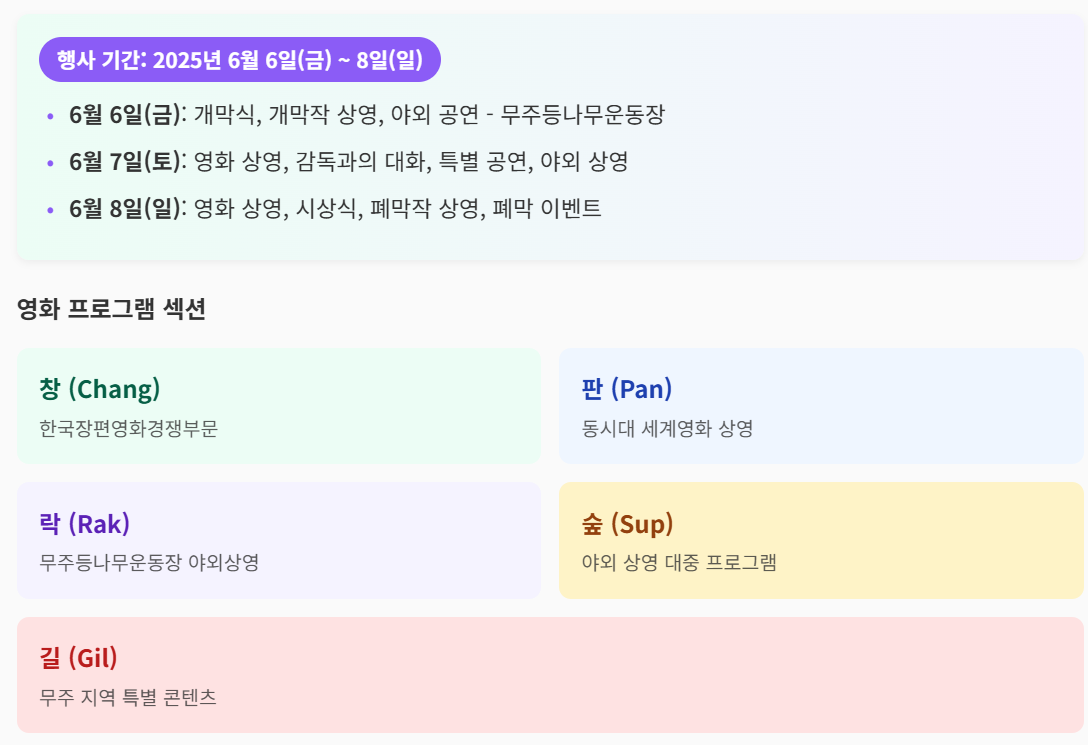 - '길' 섹션: 무주 군민과 관객을 대상으로 무주만의 콘텐츠를 소개하는 특별 섹션입니다.