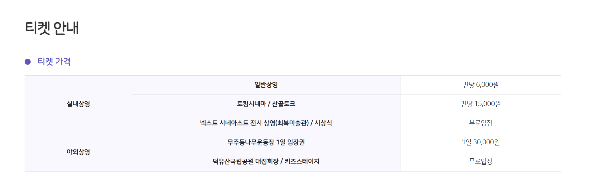 - 무주등나무운동장 1일 입장권: 야외상영 프로그램 관람 가능