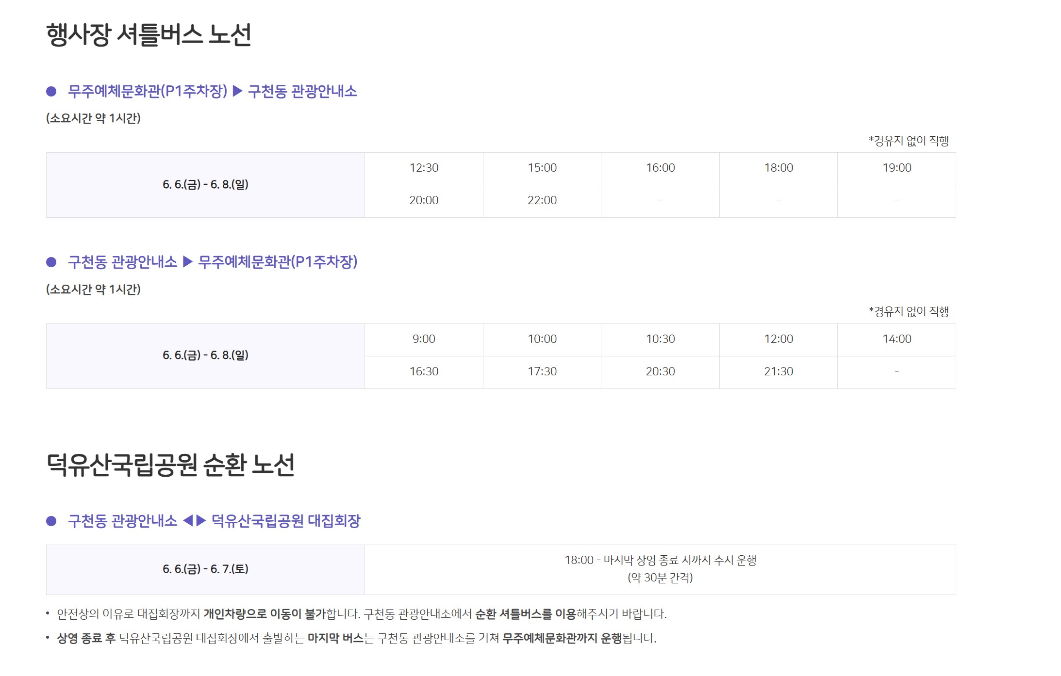 무주산골영화제는 방문객들의 편의를 위해 다양한 셔틀버스를 운행합니다.