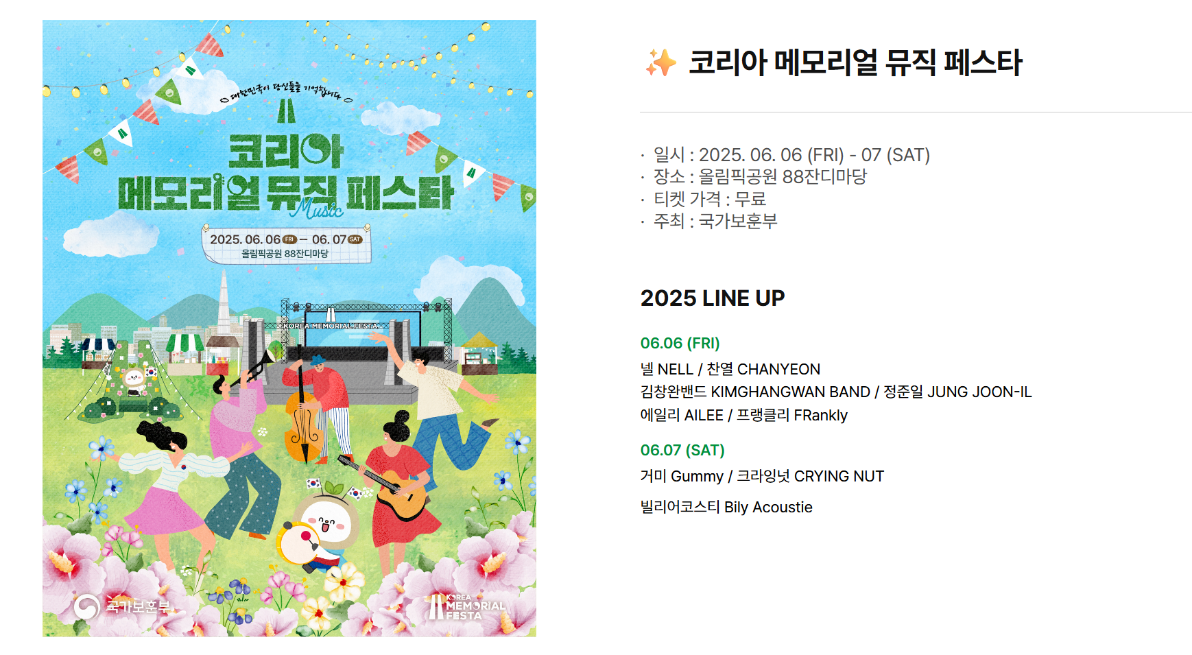 와! 정말 든든한 라인업이죠? 특히 현충일에는 넬과 찬열의 감성적인 무대를, 토요일에는 거미와 크라잉넛의 파워풀한 공연을 만날 수 있어요.