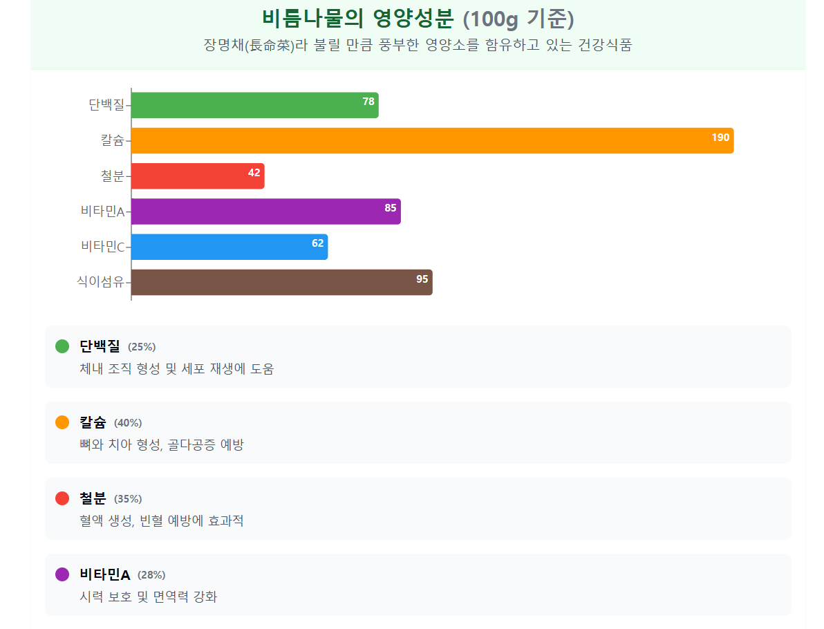 비름나물은 단백질, 칼슘, 철분, 그리고 다양한 비타민을 풍부하게 함유하고 있어요. 특히 철분 함량이 높아 빈혈 예방에 도움이 되며, 식이섬유가 풍부해 소화를 돕고 장 건강에도 좋답니다.