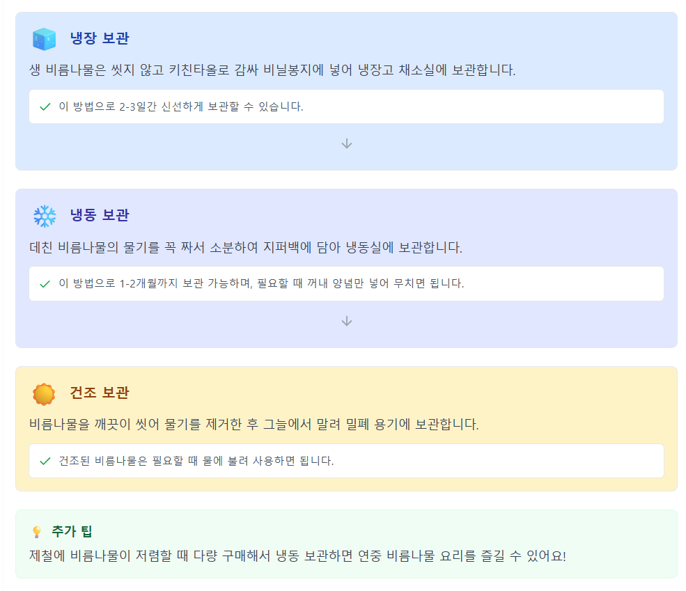 비름나물이 제철일 때 많이 구입했다면, 데쳐서 냉동 보관하는 방법도 있어요. 데친 비름나물을 소분해 냉동실에 보관했다가 필요할 때 꺼내 양념만 버무리면 간편하게 맛있는 반찬을 즐길 수 있답니다.