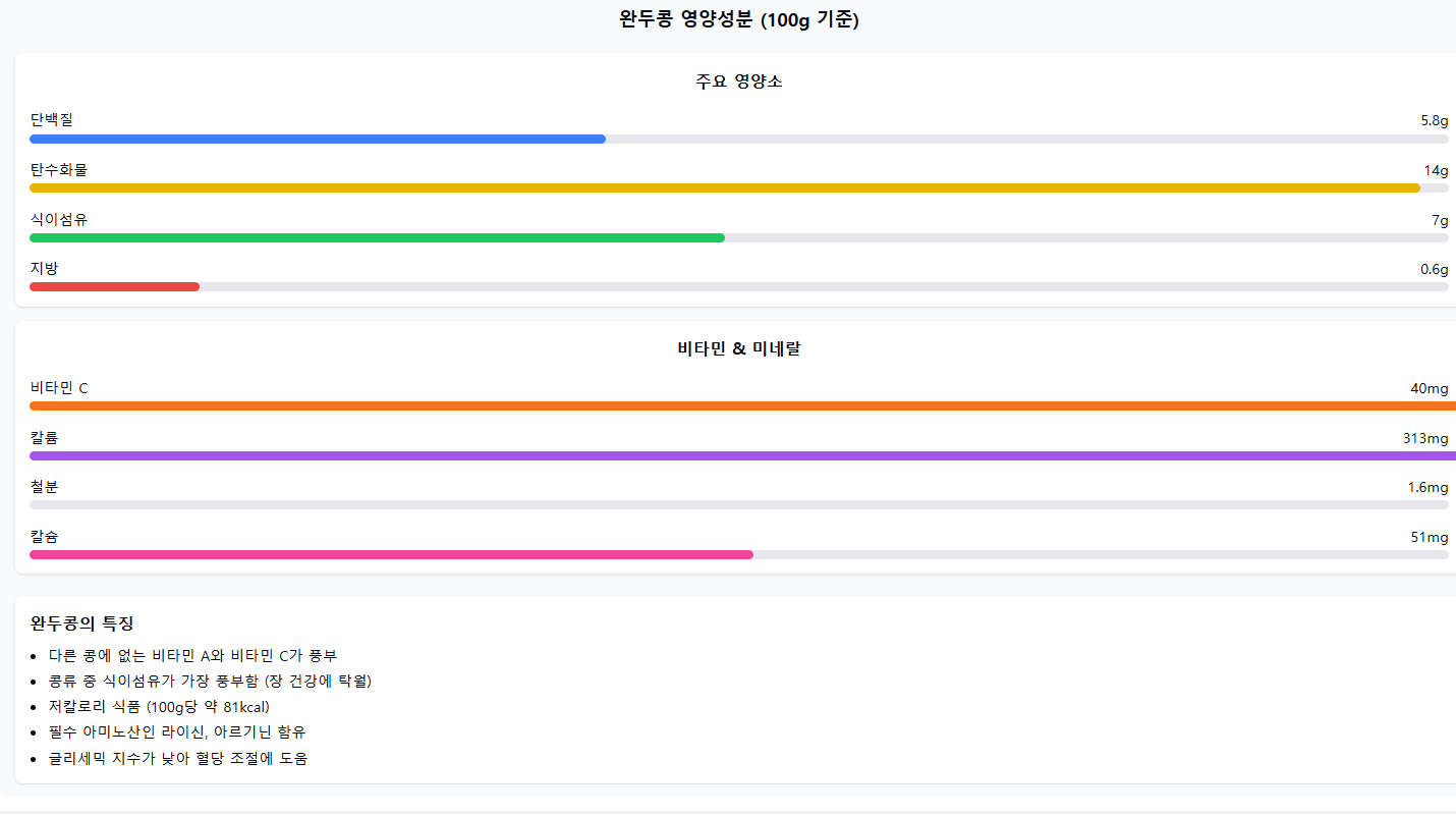 🔸 칼로리: 100g당 약 81kcal로 저칼로리 식품 🔸 단백질: 5.8g (필수 아미노산인 라이신, 아르기닌 풍부) 🔸 탄수화물: 14g 🔸 식이섬유: 7g (콩류 중 가장 풍부!) 🔸 지방: 0.6g (매우 적음)