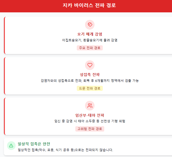 모기 외에도 성접촉, 수혈, 임신부에서 태아로의 수직감염 등을 통해 전파될 수 있어요. 특히 성접촉을 통한 전파는 드물지만 가능성이 있으며, 감염된 사람의 정액에서는 회복 후 최대 6개월까지 바이러스가 검출될 수 있다고 합니다.