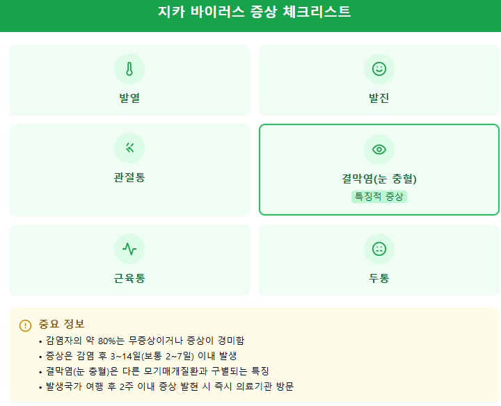 Q3. 지카 바이러스와 다른 모기매개 질환은 어떻게 구별하나요? A: 지카 바이러스는 눈의 충혈이 특징적이며, 증상이 상대적으로 경미한 편입니다. 하지만 정확한 구별을 위해서는 의료기관에서 검사를 받아야 합니다.