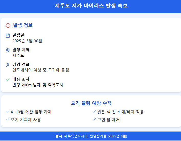 안녕하세요~ 오늘은 최근 제주도에서 처음으로 발생한 지카 바이러스 감염증에 관해 자세히 알아보려고 해요. 2025년 6월 2일 제주도에서 첫 지카 바이러스 환자가 발생했다는 소식이 전해졌는데요. 모기매개 감염병으로 특히 임산부에게 위험할 수 있어 이번 기회에 지카 바이러스에 대한 정확한 정보와 예방법을 함께 살펴보겠습니다.