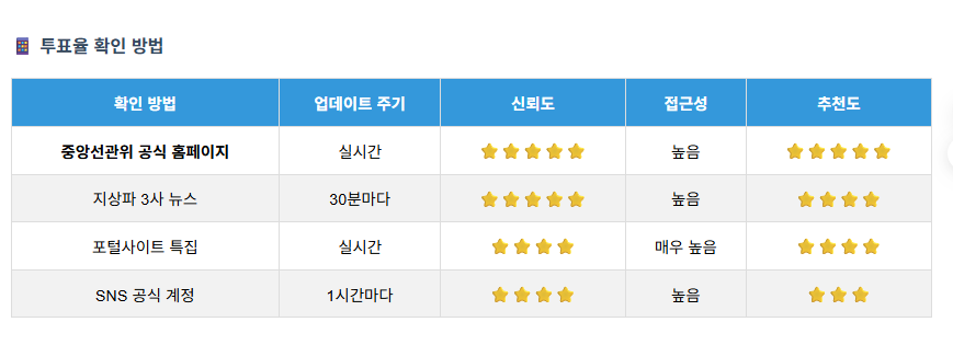 가장 궁금한 부분이죠? 실시간 투표율은 **중앙선거관리위원회 공식 홈페이지(nec.go.kr)**에서 확인하실 수 있습니다.