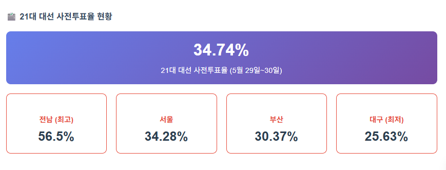 지역별로는 전남이 56.5%로 가장 높았고 대구가 25.63%로 가장 낮은 사전투표율을 기록했어요. 이처럼 지역별 차이도 흥미로운 분석 포인트가 될 수 있습니다.