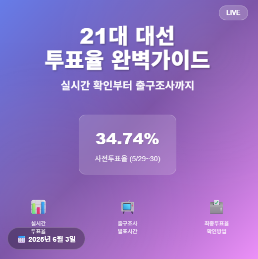 이번 21대 대선은 우리나라 민주주의 역사에서 매우 중요한 선거입니다. 실시간 투표율 확인부터 출구조사 결과까지, 정확한 정보를 바탕으로 선거 과정을 지켜보시길 바랍니다.