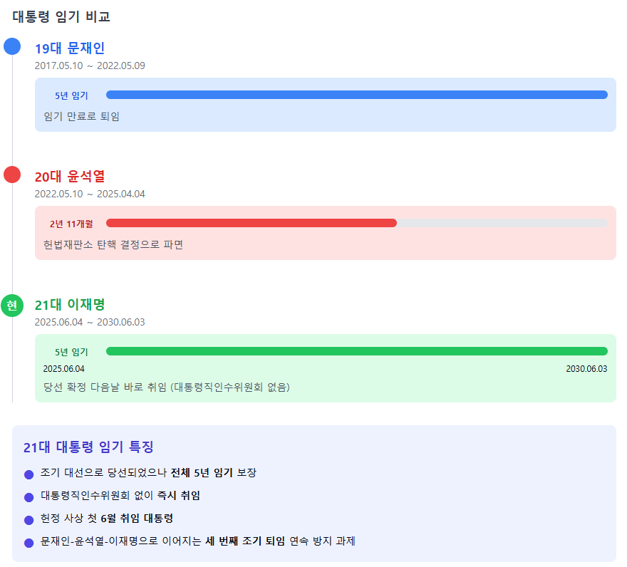 주목할 점은 대통령직인수위원회 없이 바로 취임한다는 점입니다. 일반적인 임기만료로 인한 대선과 달리, 조기 대선으로 당선된 이재명 대통령은 선거 다음날인 2025년 6월 4일에 바로 취임하게 됩니다.