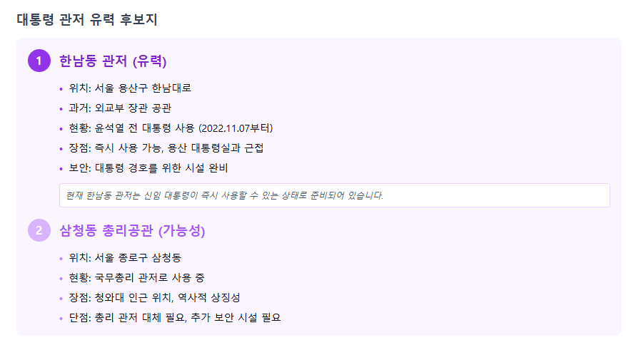 대통령 관저로는 현재 서울 용산구 한남대로에 위치한 한남동 관저가 유력하며, 삼청동 총리공관도 가능성이 있는 것으로 알려졌습니다. 현재 한남동 관저는 용산 대통령실과 함께 신임 대통령이 즉시 사용할 수 있는 상태로 준비되어 있습니다.