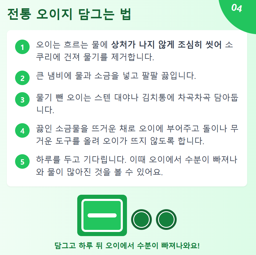 - 물기를 완전히 제거하세요: 오이 표면의 물기는 오이지 맛과 보관에 영향을 줍니다.