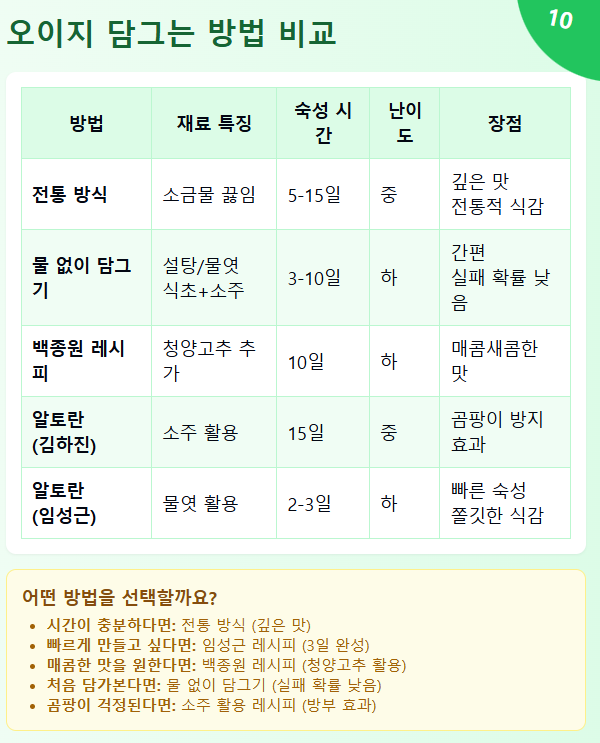 TV 프로그램 '알토란'에서 소개된 오이지 레시피도 인기가 많습니다. 알토란 레시피는 다양하지만, 김하진 요리연구가가 소개한 방법과 임성근 셰프의 물 없이 담그는 방법이 대표적입니다.