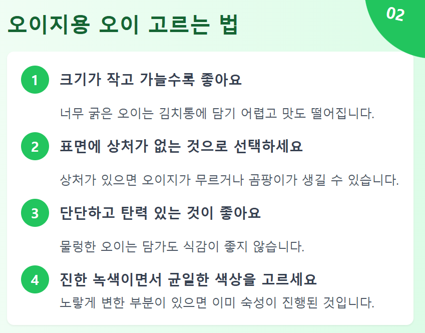 - 오이 선택이 중요합니다: 상처 없고 신선한 오이를 선택하세요.