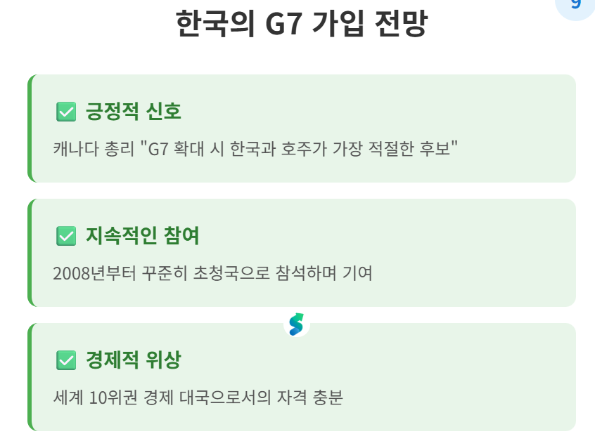우리나라는 G20의 정식 회원국이지만, G7에는 초청국 자격으로만 참석하고 있어요. 하지만 최근 G7 확대 논의가 활발해지면서 한국의 정식 가입 가능성도 높아지고 있답니다!