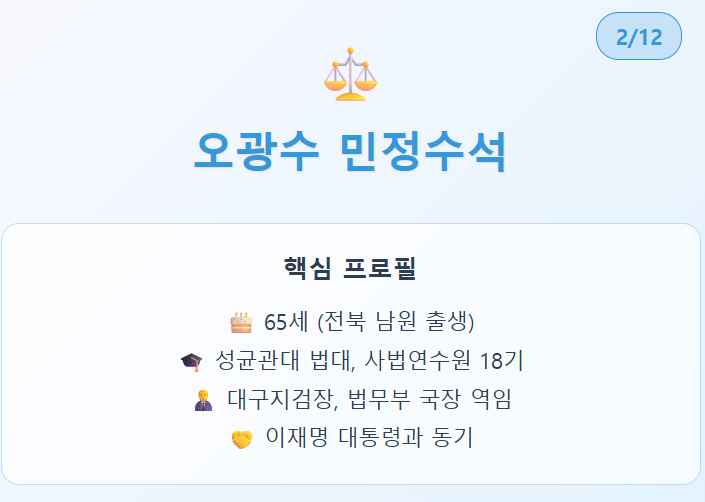 안녕하세요~ 오늘은 최근 화제가 되고 있는 민정수석 오광수와 정무수석 우상호 임명에 대해 이야기해보려고 해요. 대통령 수석비서관 인사는 항상 정치권의 큰 관심사인데, 특히 이번 인사에서는 오광수 신임 민정수석을 둘러싼 다양한 반응들이 나오고 있어서 많은 분들이 궁금해하고 계실 것 같아요. 한눈에 보는 핵심 이재명 대통령이 8일 오광수 변호사를 민정수석, 우상호 전 의원을 정무수석으로 임명했지만, 검찰 특수통 출신인 오광수 민정수석을 둘러싼 논란을 알아보겠습니다.
