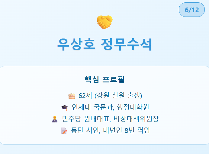 이번 인사에서 오광수 민정수석에 비해 상대적으로 논란이 적은 인물이 바로 우상호 정무수석입니다. 1962년 강원 철원 출생으로 강훈식 대통령 비서실장보다 정치 선배이며, 서울 서대문 갑에서 4선을 한 중진 정치인이에요.