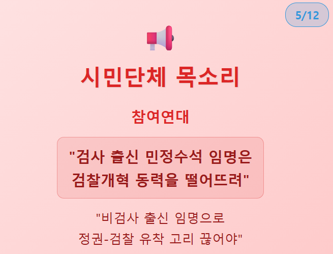 참여연대는 또한 "검찰개혁의 필요성이 그 어느 때보다 높은 지금, 검사 출신 민정수석의 임명은 검찰개혁의 동력을 떨어뜨릴 우려가 크다"며 강한 우려를 표명했어요.