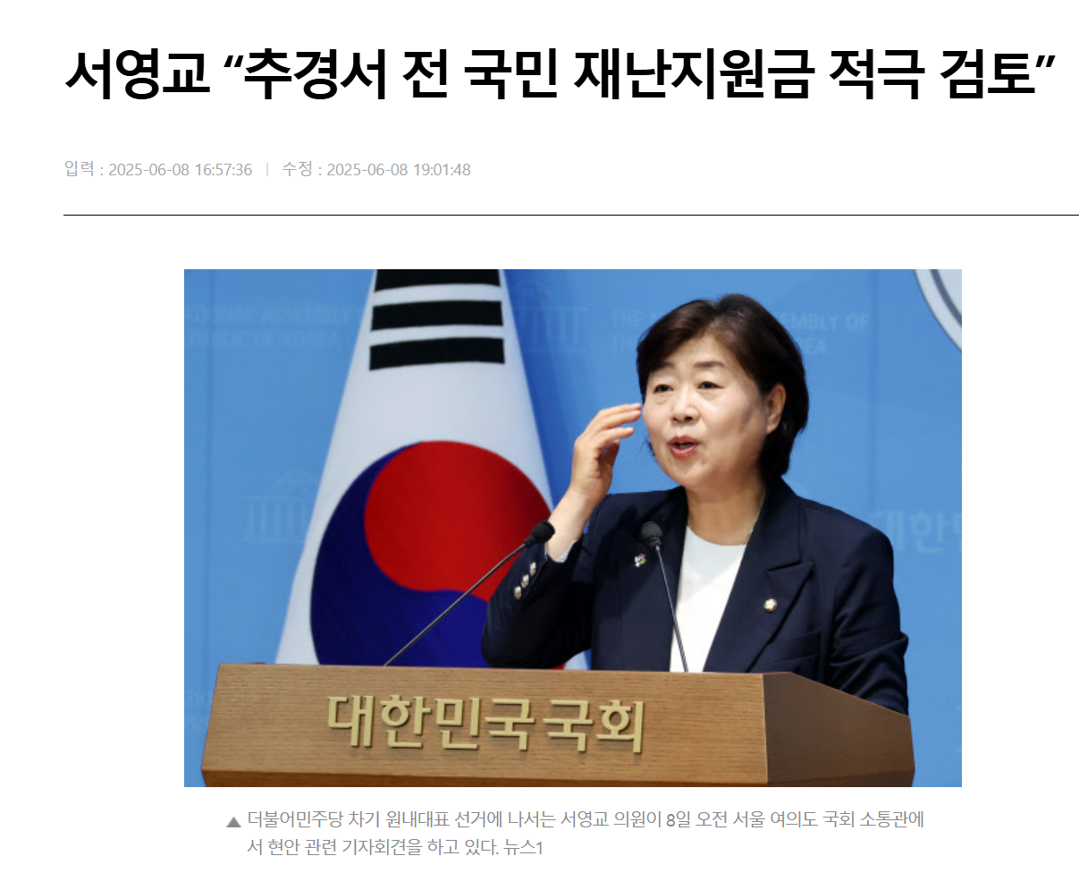 Q: 언제쯤 받을 수 있을까요? A: 오늘(6월 8일) 발표된 내용에 따르면 상당히 빨라질 것 같습니다. 서영교 의원이 "신속 집행"을 언급한 만큼, 추경 통과 후 3~4개월 내 지급 가능성이 높아 보입니다.