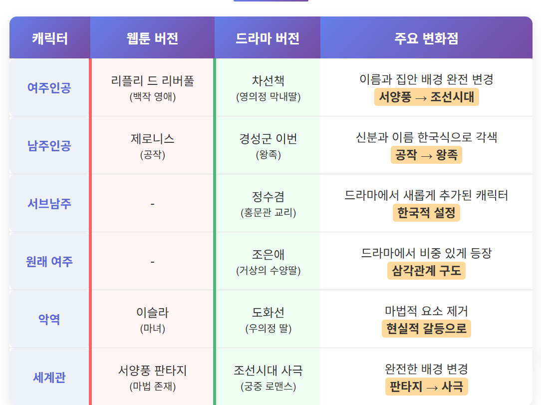웹소설이 원작인 이 작품은 먼저 웹툰으로 만들어져 네이버 웹툰에서 큰 인기를 끌었어요. 웹툰에서는 서양풍 로맨스 판타지 장르였는데, 드라마에서는 조선시대를 배경으로 한 사극 로맨스로 각색되었다는 점이 가장 큰 차이예요.