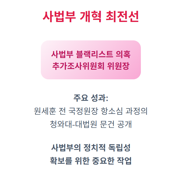 사법부 블랙리스트 추가조사위원회 위원장으로서 사법부 내부의 문제점을 파헤친 경험이 있습니다. 이는 권력의 부정부패를 조사하는 특검 업무와 직결되는 경험이에요.