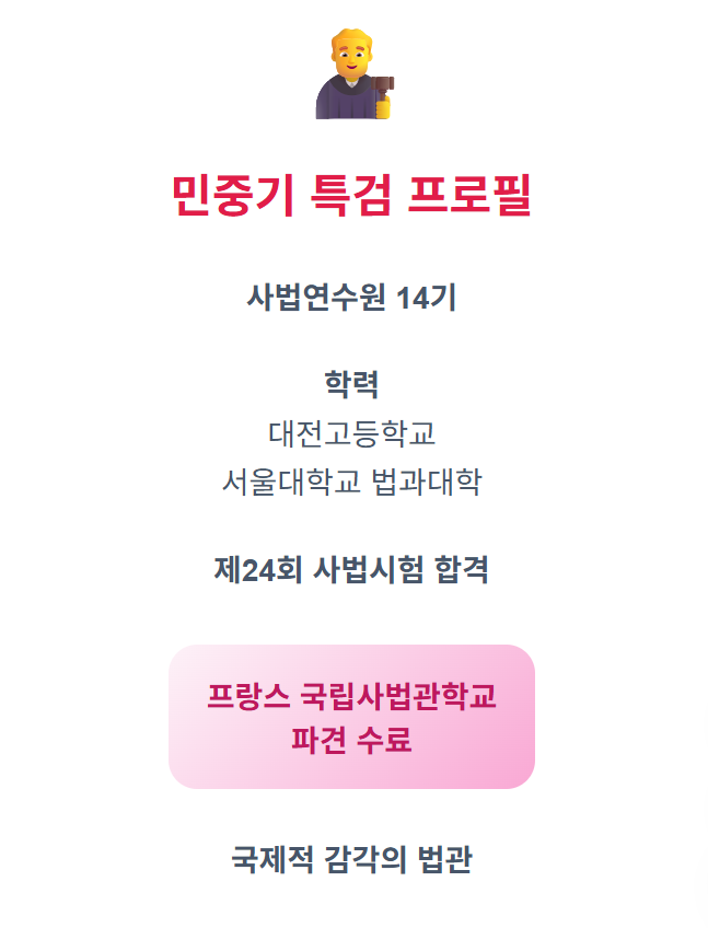 민중기 특검은 사법연수원 14기 출신으로, 대전고등학교와 서울대학교 법과대학을 졸업했습니다. 제24회 사법시험에 합격하여 법조계에 입문한 그는 특별한 이력을 가지고 있어요.