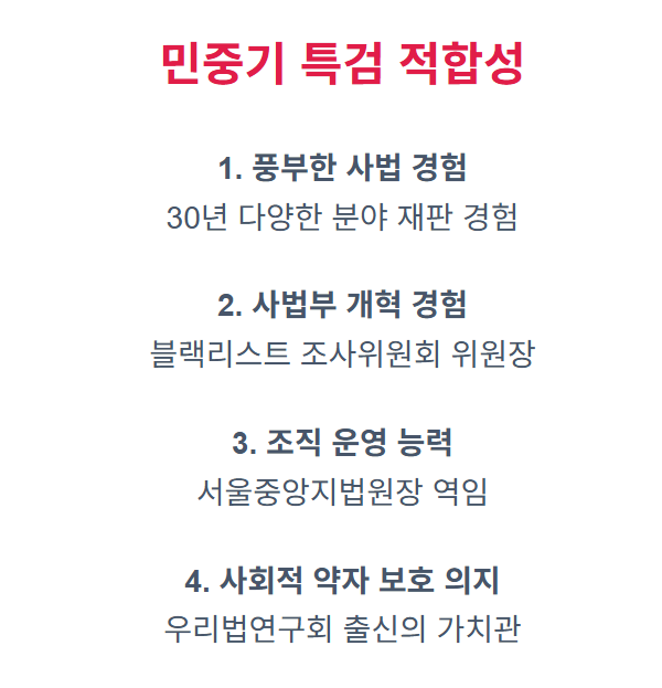 이런 배경 때문에 민중기 특검은 사회적 약자와 소수자의 권리 보호에 대한 깊은 관심을 가지고 있으며, 공정하고 투명한 재판 진행으로 정평이 나 있습니다.