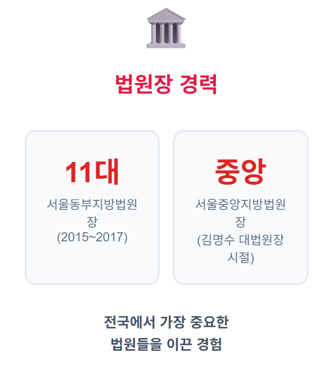 서울동부지방법원장과 서울중앙지방법원장을 역임하면서 대형 조직을 이끄는 리더십을 입증했습니다. 김건희 특검에는 40명의 검사가 파견되는데, 이런 대규모 조직을 효율적으로 운영할 수 있는 경험이 풍부해요.