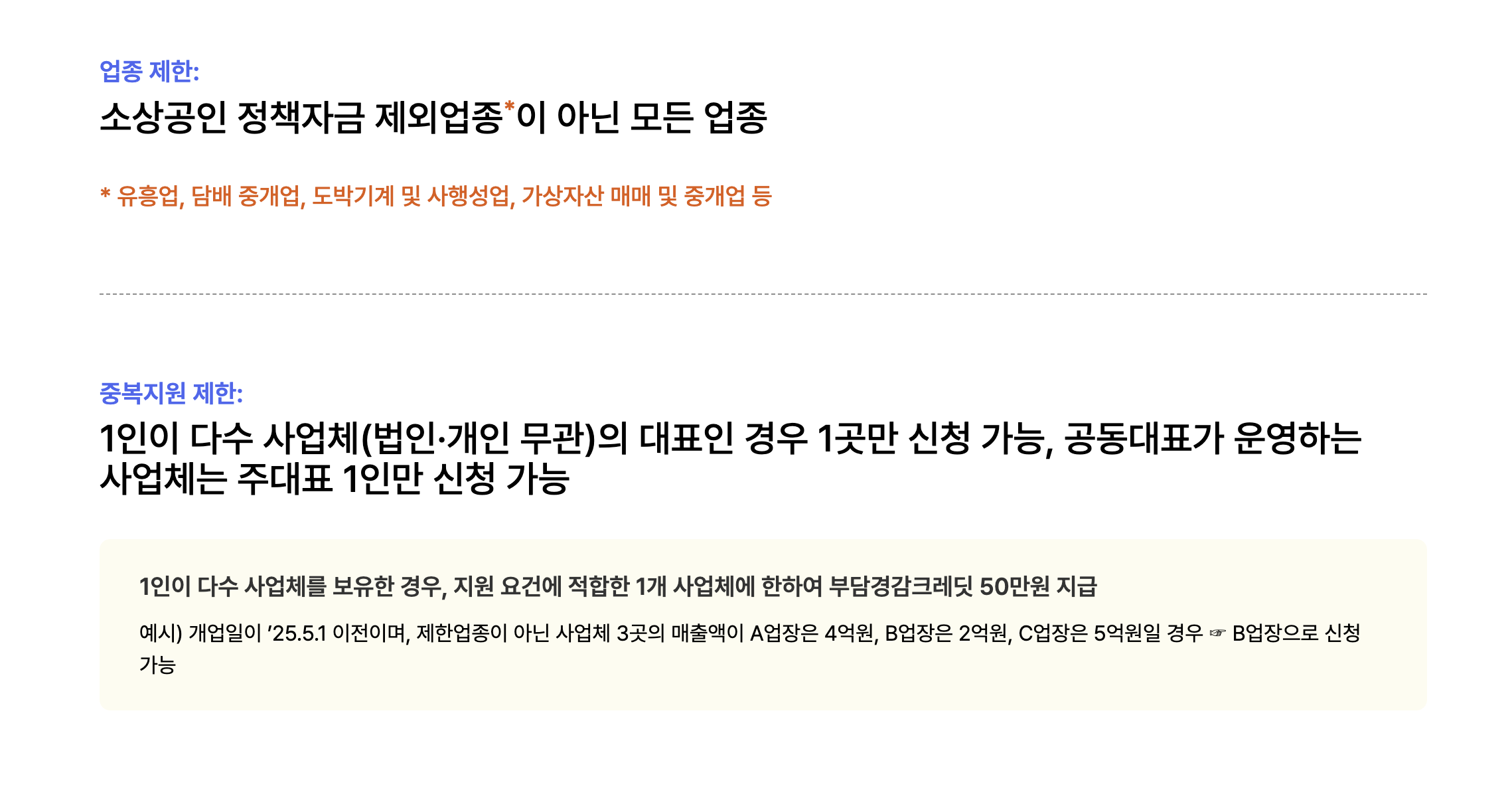유흥업, 사행성업, 담배 중개업, 도박기계업, 가상자산 매매 및 중개업 등은 제외