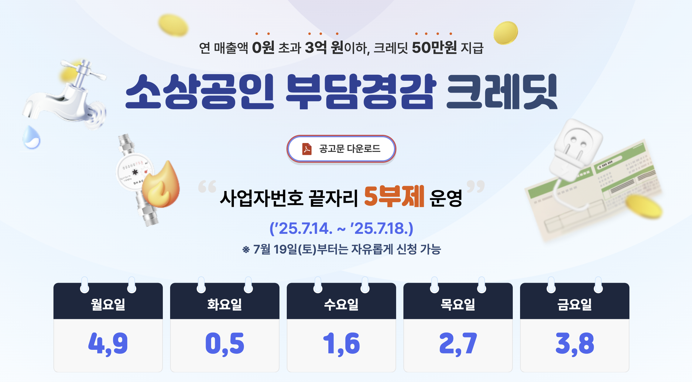 예를 들어, 사업자등록번호가 123-45-67894라면 끝자리가 4이므로 7월 14일에 신청하면 됩니다. 5부제 기간이 끝난 7월 19일(토)부터는 누구나 자유롭게 신청 가능합니다.