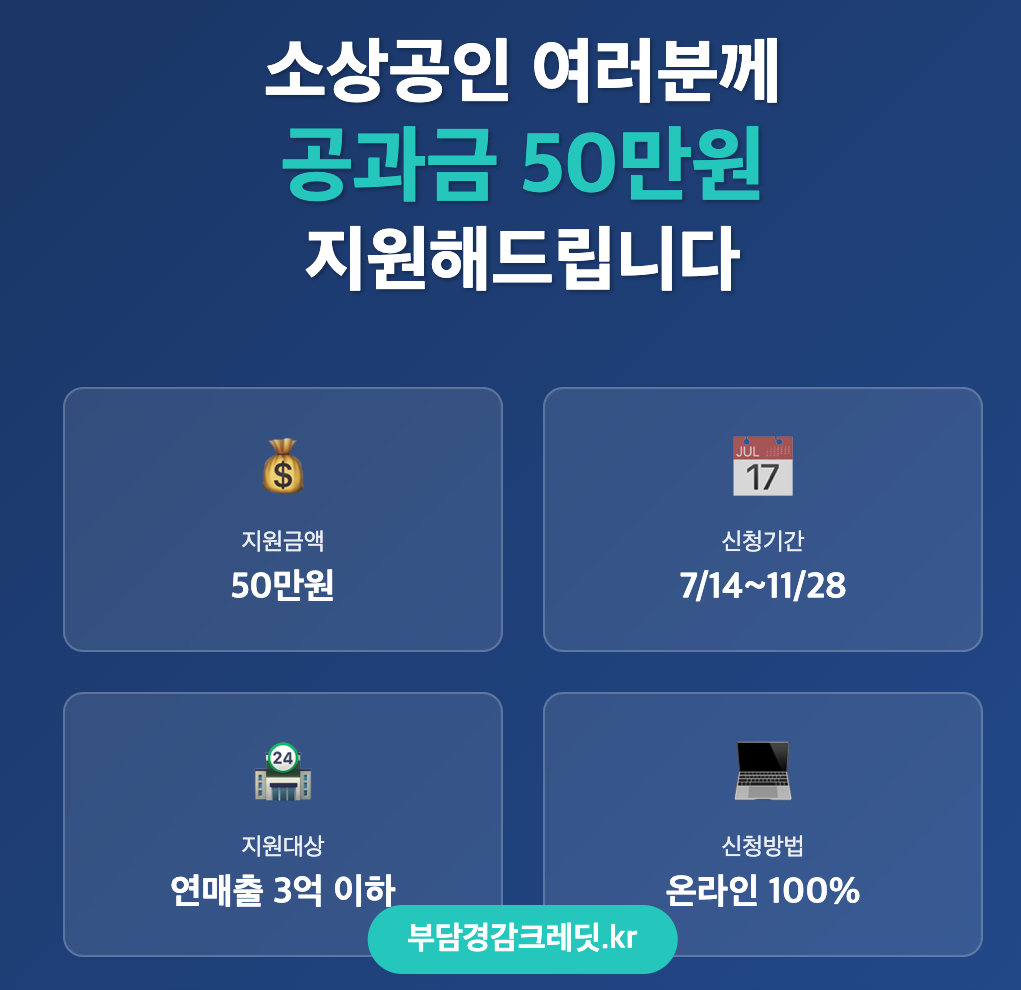 매달 전기세, 가스비에 국민연금까지... 고정비 부담에 한숨 쉬고 계신가요? 2025년 7월 14일부터 소상공인 부담경감 크레딧 신청이 시작되었습니다. 정부가 소상공인의 경영 부담을 덜어드리기 위해 공과금과 4대 보험료 납부에 사용할 수 있는 50만원을 직접 지원하는 획기적인 정책입니다.특히 이번 지원은 현금이 아닌 크레딧 형태로 지급되어 공과금과 보험료 납부에만 사용할 수 있도록 설계되었습니다. 복잡한 서류 제출 없이 온라인으로 간편하게 신청할 수 있다는 점도 큰 장점입니다.오늘은 소상공인 부담경감 크레딧의 신청 자격부터 방법, 사용처까지 꼼꼼히 알아보겠습니다.