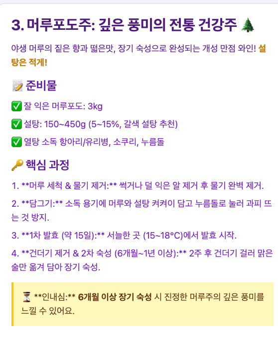 - 특별한 풍미와 건강을 생각한다면: '머루포도 전통 레시피'는 묵직하고 개성 있는 맛을 선사하며, 긴 숙성 기간을 거쳐 더욱 깊어지는 매력이 있습니다.