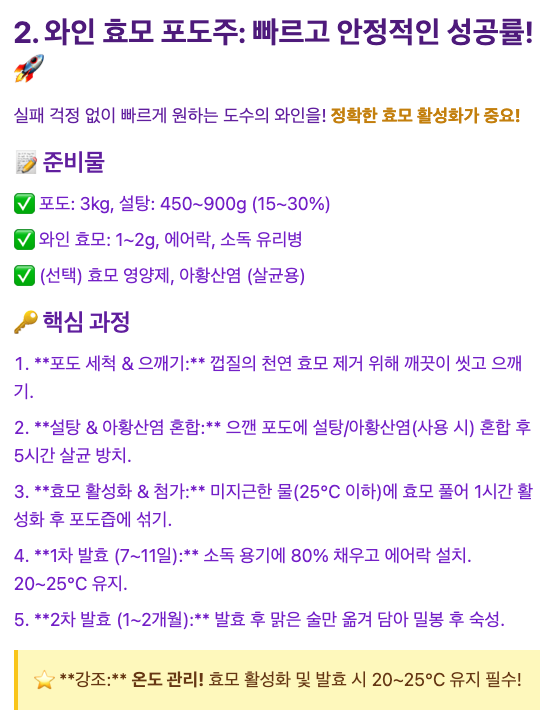 - 자연 본연의 맛을 선호한다면: '기본 황금 레시피'처럼 자연 발효 방식을 선택하여 포도의 깊은 풍미를 느껴보세요. 약간의 인내가 필요하지만 그만큼 보람을 느낄 수 있을 거예요.