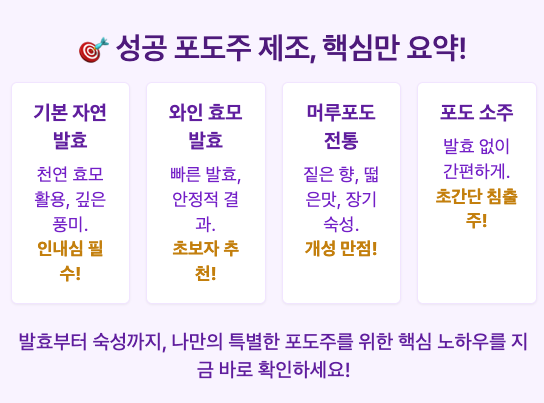 | 항목 | 기본 황금 레시피 (자연 발효) | 초고속 발효 포도주 (와인 효모 사용) | 머루포도 전통 레시피 (깊은 풍미) | 포도 소주 (간편 침출주) |