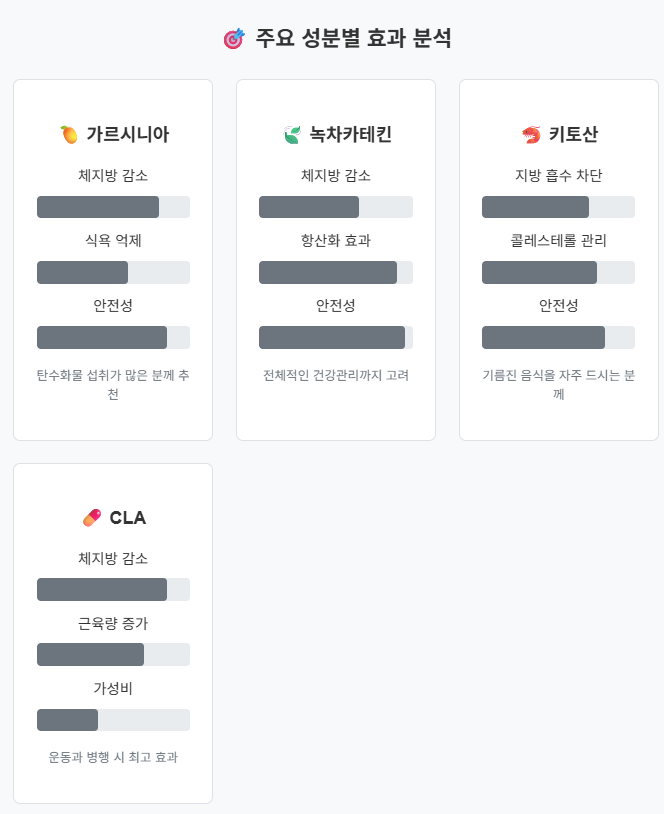 | 성분 | 체지방 감소 | 식욕 억제 | 부작용 위험도 | 가격대 |