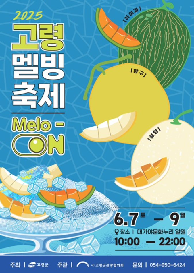 올해 첫 개최되는 고령 멜빙축제는 고령 특산물인 멜론과 여름 대표 디저트인 빙수가 만나는 특별한 축제예요. 고령군에서 생산되는 멜론은 전국 재배면적의 60-70%를 차지할 정도로 품질이 뛰어나다고 하니, 이번 기회에 제대로 맛보실 수 있을 거예요.