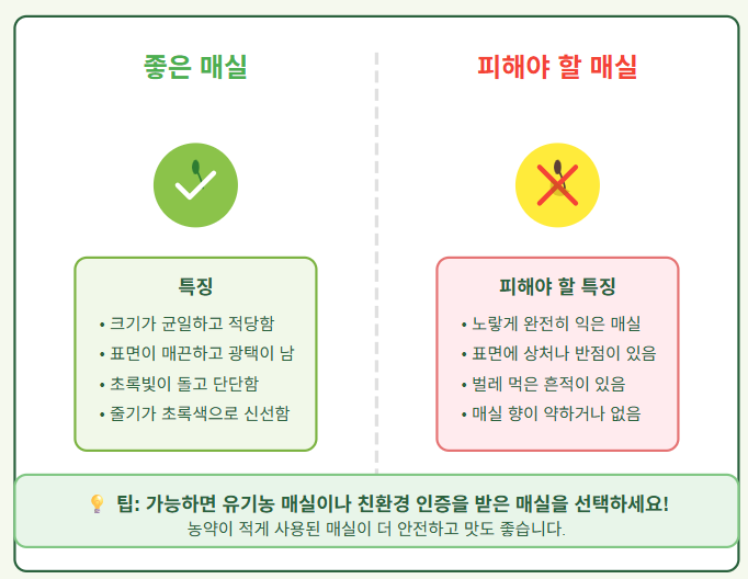 - 유기농 매실 선택: 가능하면 유기농 매실이나 친환경 인증을 받은 매실을 선택하는 것이 좋습니다. 농약이 적게 사용된 매실이 더 안전하고 맛도 좋아요.