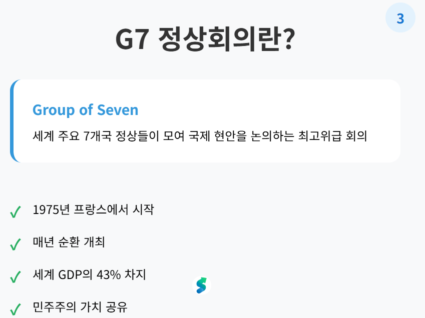 G7 정상회의는 세계 주요 7개국 정상들이 모여 국제 현안을 논의하는 최고위급 회의예요. Group of Seven의 약자로, 매년 한 번씩 개최되며 글로벌 경제와 안보 문제를 다루는 중요한 국제 협의체죠. G7은1970년대 오일 위기 이후, 선진국들이 경제 위기를 함께 극복하기 위해 만든 협의체가 바로 G7의 시작이랍니다.