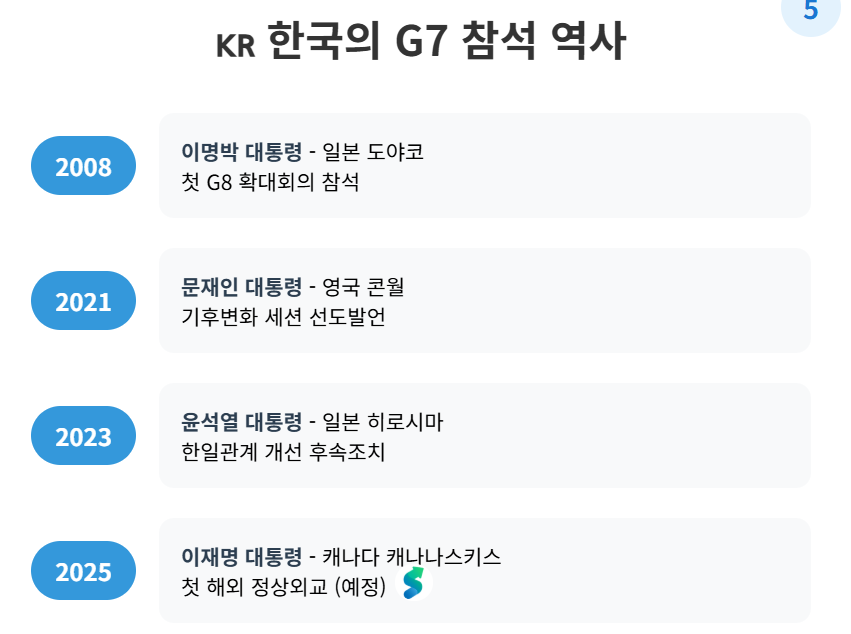 흥미로운 사실! 최근 캐나다의 마크 카니 총리가 인터뷰에서 "G7 확대 시 가장 적절한 후보는 호주와 한국"이라고 직접 언급했습니다. 미국과 영국도 G7 확대에 긍정적인 입장이라고 하니, 한국이 G7 정식 회원국이 될 수 도 있다는 이야기도 나옵니다.