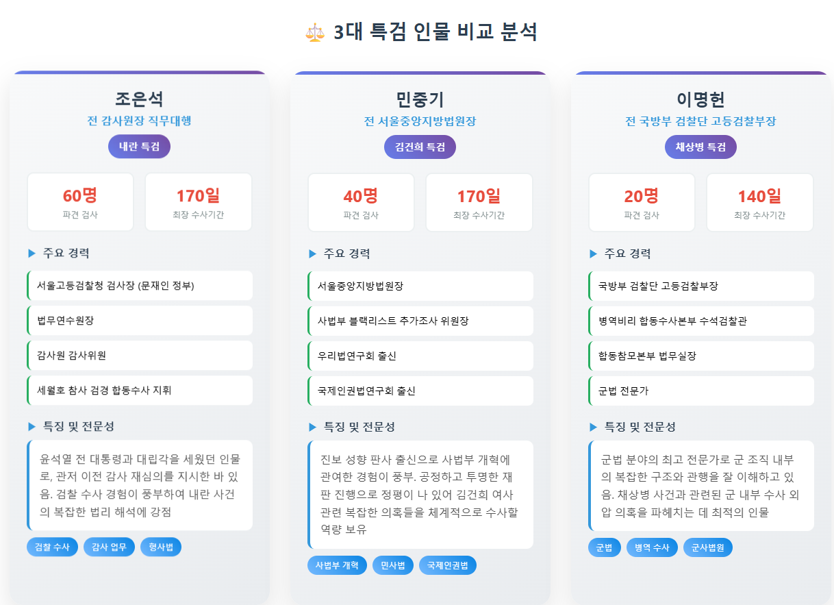 특히 이번 특검들이 모두 해당 분야의 전문가들이라는 점에서 더욱 기대가 큽니다. 조은석 특검의 검찰 경험, 민중기 특검의 사법부 개혁 경험, 이명헌 특검의 군법 전문성까지, 각자의 분야에서 최고의 역량을 발휘할 수 있을 것 같아요.