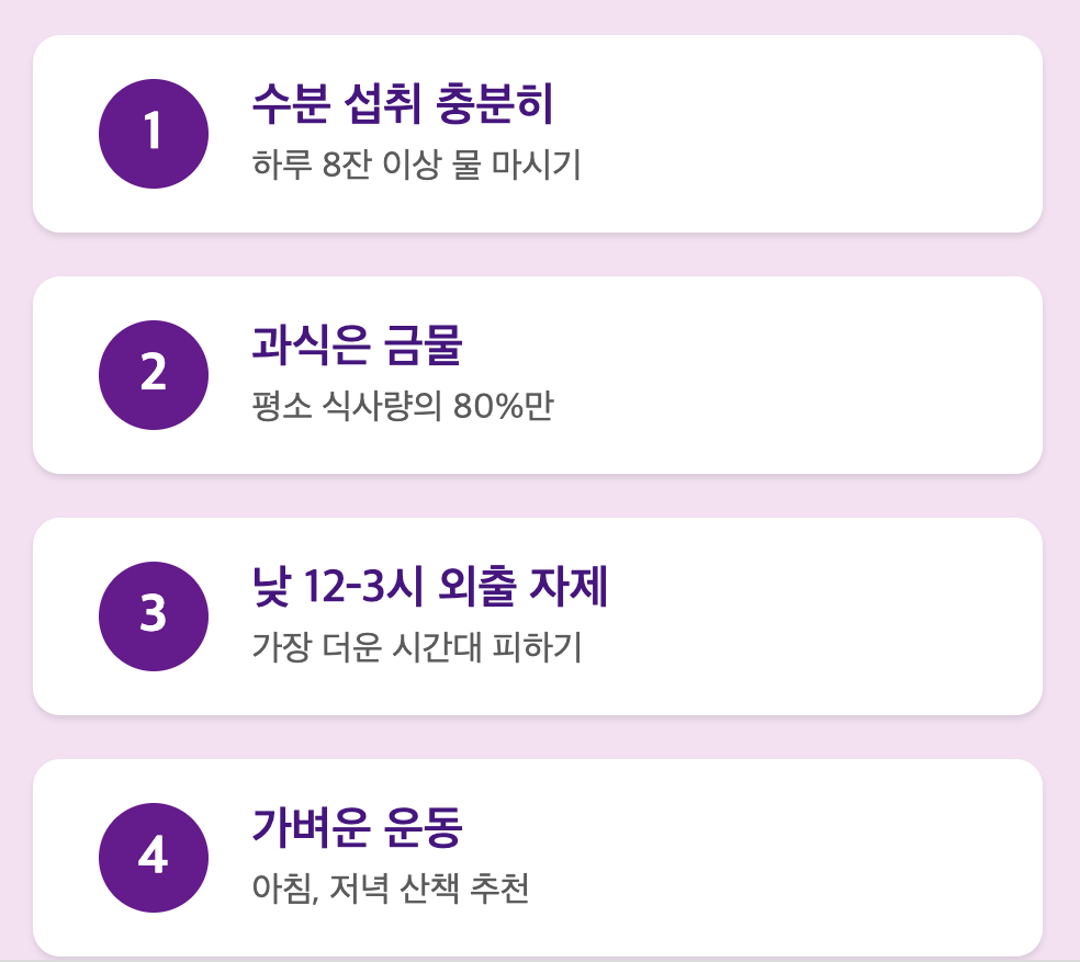 - 수분 섭취 충분히: 땀으로 빠져나간 수분과 미네랄 보충