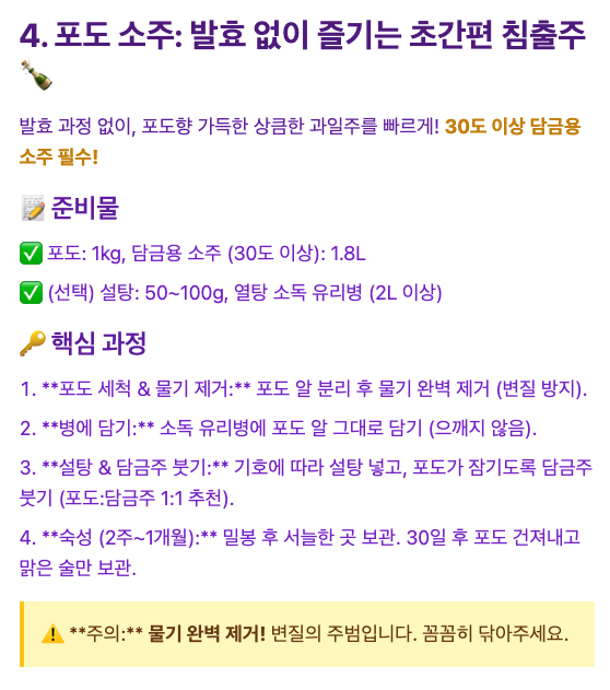 - 간편하게 포도 향을 즐기고 싶다면: '포도 소주'는 발효 과정 없이 바로 즐길 수 있어 부담 없이 시작하기 좋습니다.